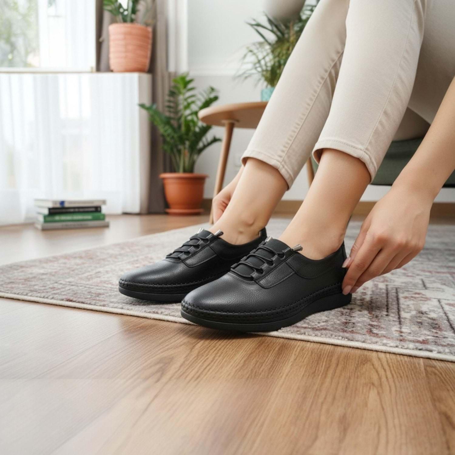 Sade ama etkileyici tasarımıyla Kadın Deri Günlük Comfort Ayakkabı 2005 – Siyah, günlük stilinizin vazgeçilmez parçası olmaya aday! Her adımda maksimum konfor ve zamansız şıklık sunan bu model, içi ve dışı hakiki deri yapısıyla ayağınızın nefes almasına yardımcı olur ve uzun süreli rahatlık sağlar. Günlük şehir yürüyüşlerinden ofise, casual kombinlerden hafta sonu aktivitelerine kadar her ortamda kendini gösterir.